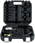 Специальный набор СТ-Н001 предназначен для измерения компрессии в цилиндрах дизельных двигателей. Набор состоит из манометра с гибким шлангом, на одном конце которого находится клапан сброса давления. На другом конце гибкого шланга, быстроразъёмный фитинг для быстрого де/монтажа выбранного типа адаптера. Длина армированного шланга составляет 340 мм. В наборе присутствуют два типа адаптеров. Для замера компрессии через свечное отверстие и специальные адаптеры через отверстие дизельной форсунки. Наличие адаптеров с различной резьбой позволяет использовать набор для многочисленного парка дизельных автомобилей.